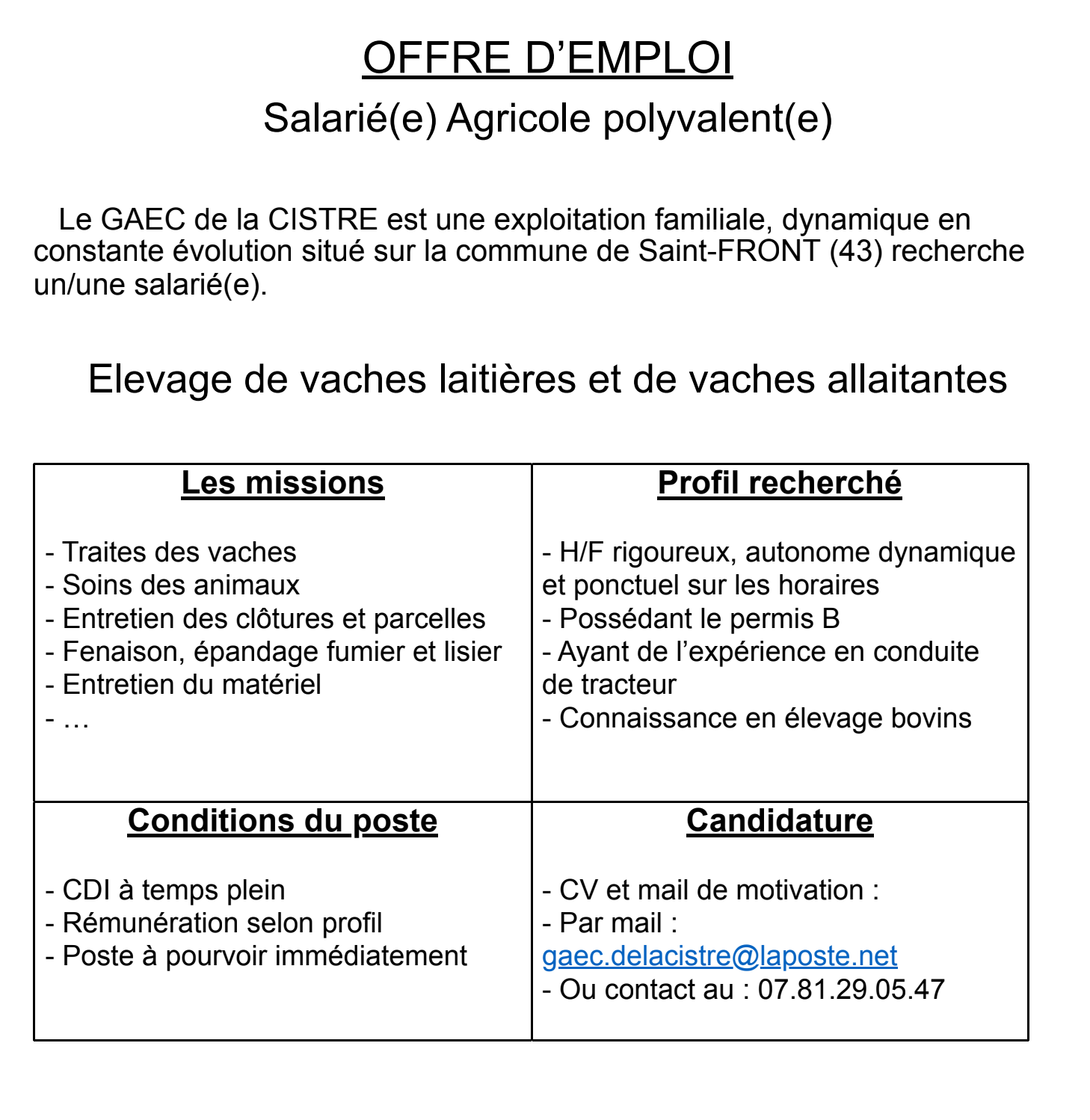 Vous êtes ici : Accueil > OFFRE D'EMPLOI : St Front
