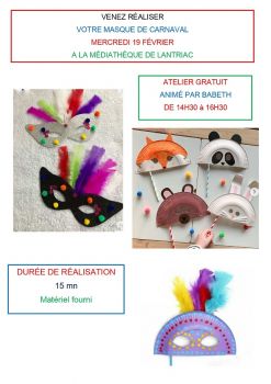 Ce temps d’animation gratuit se fera sans inscription. La durée de réalisation du masque sera d’environ 15 mn. Le matériel sera fourni.