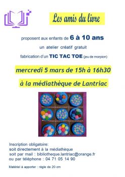Mercredi 5 mars, un atelier créatif gratuit, pour les enfants de 6 ans à 10 ans « création d’un tic-tac-toé » (jeu de morpion) animé par Audrey aura lieu à la médiathèque de 15 h à 16h30.